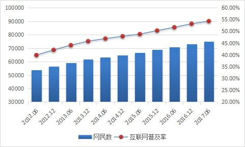 根據(jù)CNNIC最新數(shù)據(jù)顯示,截止2017年6月,我國網(wǎng)民規(guī)模達到7.51億,半年共計新增網(wǎng)民1992萬人?;ヂ?lián)網(wǎng)普及率為54.3%,較2016年底提升1.1個百分點。我國網(wǎng)民規(guī)模增長趨于穩(wěn)定,互聯(lián)網(wǎng)行業(yè)持續(xù)穩(wěn)健發(fā)展,以互聯(lián)網(wǎng)為代表的數(shù)字技術正在加速與經(jīng)濟社會各領域深度融合,成為促進我國消費升級、經(jīng)濟社會轉(zhuǎn)型、構建國家競爭新優(yōu)勢的重要推動力。