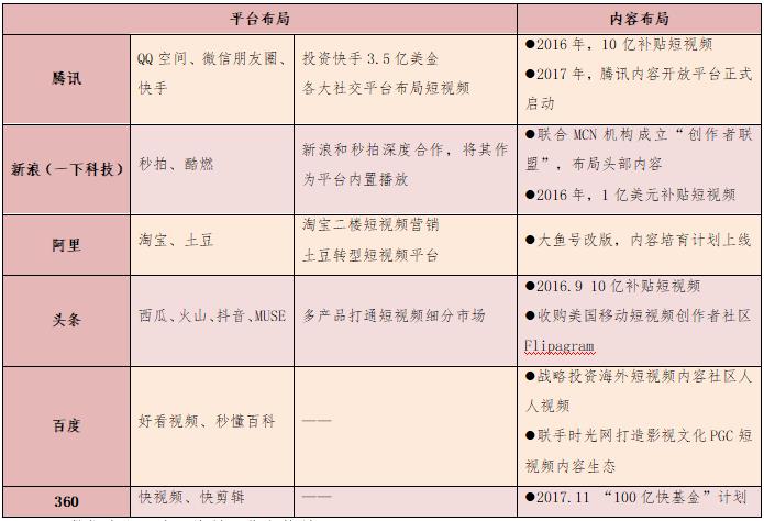 以BAT為首的機構重金加速布局短視頻平臺。今日頭條、騰訊、秒拍等均投入10億元扶持短視頻內(nèi)容創(chuàng)業(yè)者。阿里投入20億元進軍短視頻領域,將土豆網(wǎng)打造為專門的短視頻平臺。騰訊專門成立短視頻中心,負責短視頻平臺運行;愛奇藝短視頻平臺的愛奇藝頭條正在內(nèi)測;秒拍成為新浪微博獨家短視頻應用,從工具型短視頻機構轉(zhuǎn)型為社交分享類短視頻平臺;華人文化基金領投的資訊類短視頻平臺梨視頻也已形成業(yè)內(nèi)影響力;咪咕視訊作為中國移動在視頻領域的唯一版權運營實體,也布局短視頻,與中央電視臺共建業(yè)內(nèi)領先的短視頻創(chuàng)作者聚集平臺,打造頭部賬號體系,孵化自有明星短視頻賬號,引入知名工作室直接簽約,盤整已有的強IP資源賬號化運作。