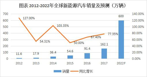 在此背景下,全球新能源汽車銷售量從2011年的5.1萬輛增長至2017年的1621萬輛,6年時間銷量增長30.8倍。未來隨著支持政策持續(xù)推動、技術(shù)進步、消費者習慣改變、配套設施普及等因素影響不斷深入,GGI預計2022年全球新能源汽車銷量將達到600萬輛,相比2017年增長2.7倍。