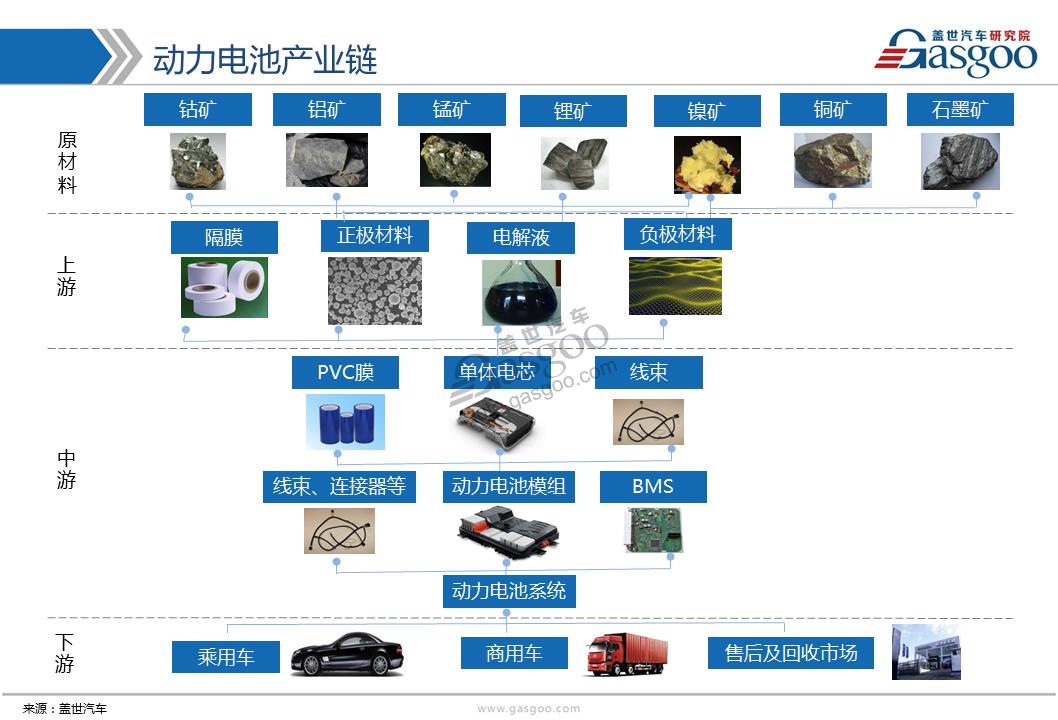 動力電池產(chǎn)業(yè)鏈分為上、中、下游,從下圖中可以看到,上游包括鈷、錳、鎳、鋰以及石墨礦產(chǎn),也是當下主流動力電池原材料構(gòu)成。其中鋰礦應用最為廣泛,而石墨一般只作為負極材料。中游產(chǎn)業(yè)鏈包括由正負極、電解液、隔膜、極耳加工形成電芯、PVC膜、線束。而下游產(chǎn)品則是電池模組、線束、連接器以及BMS管理系統(tǒng),整體形成動力電池零部件。