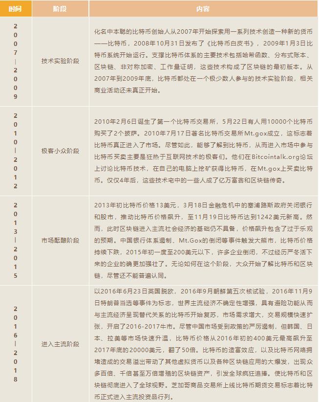 區(qū)塊鏈?zhǔn)怯梢幌盗屑夹g(shù)實(shí)現(xiàn)的全新去中心化經(jīng)濟(jì)組織模式,2009年誕生于比特幣系統(tǒng)的構(gòu)建,2017年成為全球經(jīng)濟(jì)熱點(diǎn),但區(qū)塊鏈的成功應(yīng)用寥寥,這個新興產(chǎn)業(yè)還遠(yuǎn)未成熟。其發(fā)展大體可劃分為六個階段。