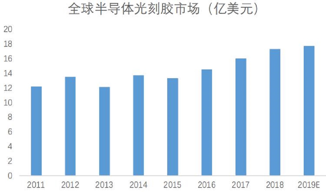 由于半導(dǎo)體光刻膠主要應(yīng)用于半導(dǎo)體制造,故半導(dǎo)體光刻膠市場與對應(yīng)晶圓廠產(chǎn)能密切相關(guān)。根據(jù)SEMI公布數(shù)據(jù),2018年全球半導(dǎo)體光刻膠市場共17.3億美元,同比增長2.3%。自2016年來,全球光刻膠市場年均復(fù)合增長率為9.23%。
