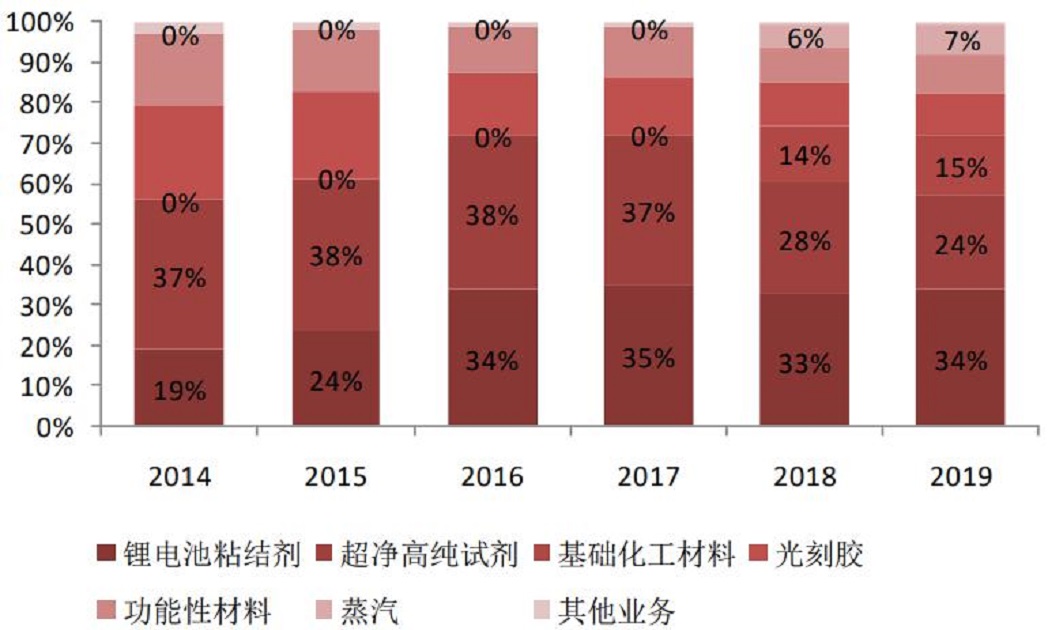 2018年,公司實現(xiàn)營業(yè)收入14.46億元,同比增長76.23%,實現(xiàn)歸母凈利潤2.84億元,同比增長239.37%。其中電子化學(xué)品占公司總營收的64.9%,是公司最主要的收入來源。
