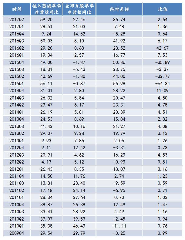 根據(jù)與全部A股營收相比較,在2012年之前,植入器械的營收總體上與全部A股的保持一致。2012年之后,全部A股的營收變動(dòng)相對(duì)平緩;而植入器械行業(yè)營收基本高于全部A股營收,在2016年經(jīng)歷谷值之后,行業(yè)保持增長的趨勢(shì)。