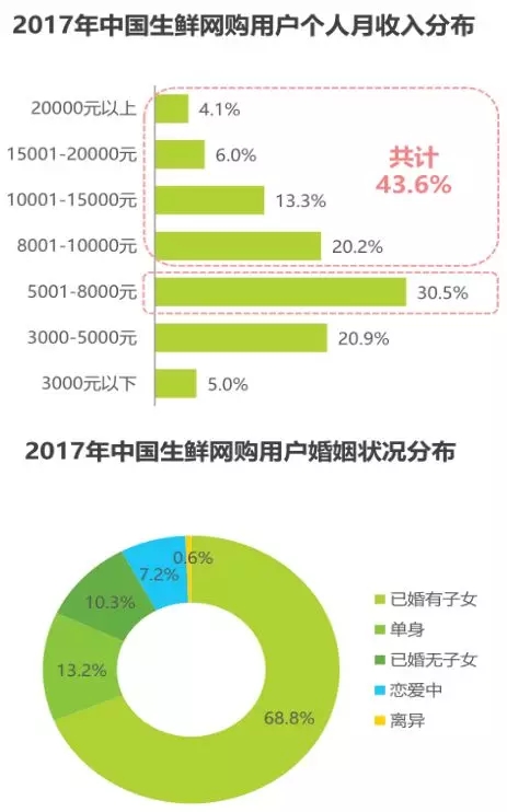 從用戶屬性來看,體驗過創(chuàng)新模式的用戶中高學(xué)歷、高家庭月收入的人群占比均高于整體生鮮網(wǎng)購用戶,與創(chuàng)新模式中高端消費(fèi)者的定位相吻合。體驗過創(chuàng)新模式的用戶中78.2%擁有大學(xué)本科及以上學(xué)歷,80.7%的用戶家庭月收入在10000元以上,其中家庭月收入在10001-15000元的用戶最多,占比達(dá)28.2%。