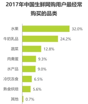 3、生鮮網(wǎng)購仍以水果為主品類,高頻剛需引流作用明顯。