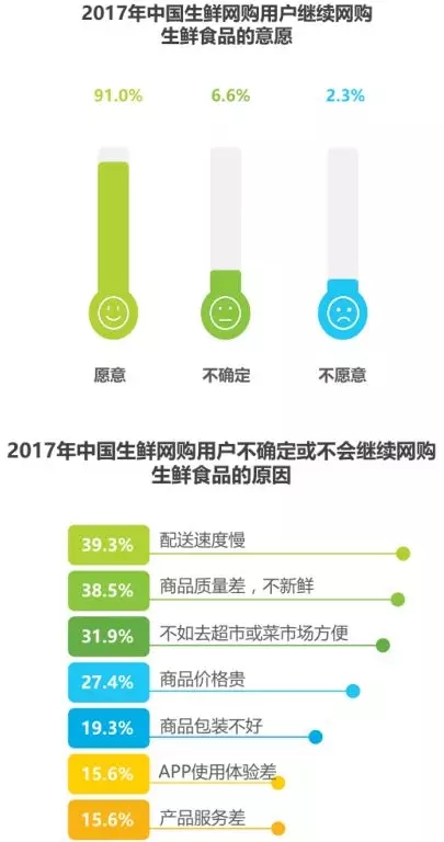九成以上用戶愿意繼續(xù)網(wǎng)購生鮮食品,配送速度慢和品質(zhì)問題是用戶不確定或不會繼續(xù)購買的主因。