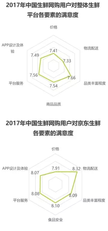 ? 用戶對生鮮網(wǎng)購整體滿意度較高;京東生鮮各維度滿意度均高于行業(yè)整體,物流配送方面優(yōu)勢明顯。