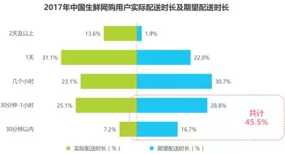 用戶期待更快速的配送體驗,45.5%的用戶希望配送時長在1小時內(nèi)。