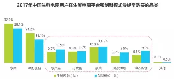 水果、乳品是創(chuàng)新模式最受歡迎的品類,在創(chuàng)新模式購買水產(chǎn)品、肉禽蛋及蔬菜等品類用戶占比更高。