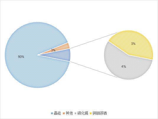 晶硅太陽能電池約占市場份額90%;薄膜太陽能電池占市場份額約10%,其中碲化鎘市場份額約4%,銅銦鎵硒約占市場份額3%。其他薄膜電池如軍工領(lǐng)域應(yīng)用較多的砷化鎵、目前無法規(guī)模化的鈣鈦礦等太陽能電池占市場份額約3%。碲化鎘目前90%的市場由美國薄膜電池制造商First Solar壟斷。