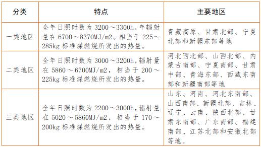 太陽能資源的分布與各地的緯度、海拔高度、自然地理狀況和氣候條件有關(guān)。我國屬太陽能資源豐富的國家之一,全國總面積2/3以上地區(qū)年日照時(shí)數(shù)大于2000h,根據(jù)中國氣象局風(fēng)能太陽能評估中心推薦的國內(nèi)太陽能資源地區(qū)分類辦法,共分5類,其中: