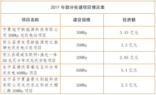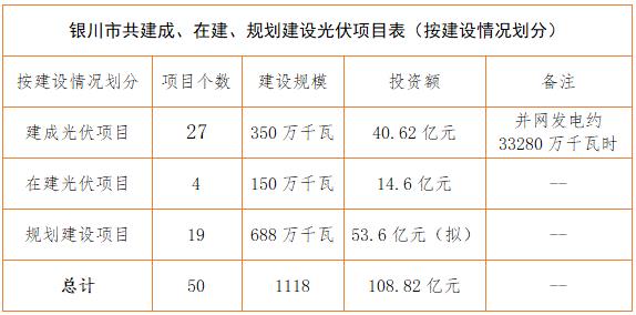 銀川市發(fā)改委項(xiàng)目資料顯示情況:截止2017年上半年,銀川市共建成、在建、規(guī)劃建設(shè)光伏項(xiàng)目50個(gè),建設(shè)規(guī)模1118萬千瓦,投資約108.82億元。