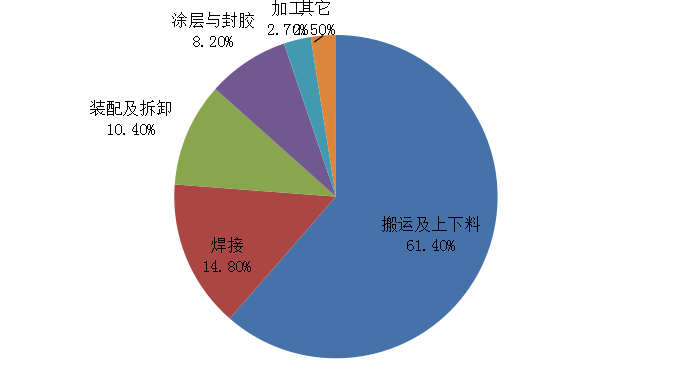 在國產(chǎn)工業(yè)機(jī)器人市場中,搬運(yùn)及上下料銷量同比增長40.8%,占比達(dá)61.4%;焊接銷量同比增長9.7%,占比達(dá)14.8%;裝配及拆卸銷量同比增長5.4%,占比達(dá)10.4%。
