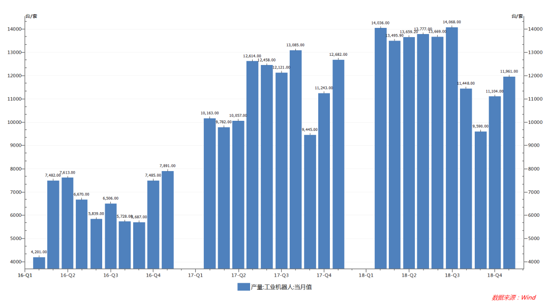 2018年1-12月,我國工業(yè)機(jī)器人產(chǎn)量達(dá)14.7萬臺(tái),同比增長12.2%;其中12月份產(chǎn)量達(dá)11961臺(tái)。受國內(nèi)宏觀經(jīng)濟(jì)下行,下游汽車、3C、新能源等行業(yè)投資放緩和中美貿(mào)易戰(zhàn)的影響,國內(nèi)工業(yè)機(jī)器人行業(yè)發(fā)展壓力逐步顯現(xiàn),6月、7月、8月增幅相比前幾個(gè)月35%的增速大幅下降。但工業(yè)機(jī)器人行業(yè)短期的增速放緩并不能改變機(jī)器代人的大趨勢。我國自動(dòng)化改造空間巨大,制造業(yè)轉(zhuǎn)型升級(jí)迫切;人口紅利逐步消失,老齡化問題嚴(yán)重,勞動(dòng)力出現(xiàn)短缺;疊加國家政策的大力支持,我國工業(yè)機(jī)器人行業(yè)未來發(fā)展空間仍然巨大。
