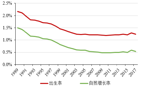另一方面,中國近年來的人口出生率和自然增長率也呈現(xiàn)不斷下降的趨勢,2017年比2016年出生人口減少了63萬人,人口出生率僅為12.4‰,同比降低0.5‰,這一數(shù)據(jù)比日本的出生率還要低。我國的人口自然增長率更是下降到5.3‰,長期的低生育水平直接加大了對(duì)未來我國勞動(dòng)力不足的擔(dān)憂。