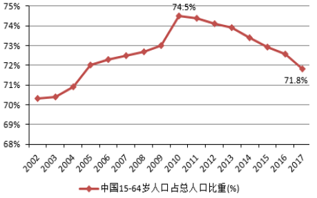 近年來,中國人口結(jié)構(gòu)發(fā)生了巨大變化,15-64歲勞動(dòng)適齡人口占總?cè)丝诘谋戎刈?011年以來呈現(xiàn)逐步下滑的趨勢,2017年該比重已經(jīng)下滑至71.8%,相比2010年的最高點(diǎn)降低了2.7個(gè)百分點(diǎn)。另外,中國社會(huì)的老齡化問題更加嚴(yán)重,中國人口紅利逐步消失,目前已經(jīng)出現(xiàn)了劉易斯拐點(diǎn)。人口結(jié)構(gòu)的變化,勞動(dòng)力供給條件的變化顯著的推高了我國的勞動(dòng)成本,不僅削弱了制造業(yè)的競爭力,對(duì)勞動(dòng)密集型的產(chǎn)業(yè)同樣也帶來了嚴(yán)峻的挑戰(zhàn),也削弱了中國產(chǎn)品在全球市場的競爭力。
