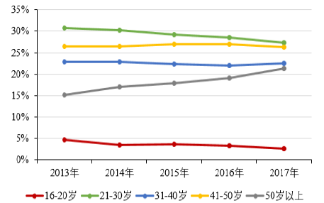 農(nóng)民工是我國城鎮(zhèn)化進(jìn)程中的勞動(dòng)力主力軍,然而近年來,農(nóng)民工群體也呈現(xiàn)出逐步老齡化的特征,農(nóng)民工平均年齡不斷提高,50歲以上農(nóng)民工所占比重提高較快。2017年農(nóng)民工平均年齡為39.7歲,比16年提高0.7歲。從年齡結(jié)構(gòu)看,30歲以下的年青一代農(nóng)民工所占比重為29.9%,比16年下降2.0個(gè)百分點(diǎn);40歲及以下農(nóng)民工所占比重為52.4%,比16年下降1.5個(gè)百分點(diǎn);50歲以上農(nóng)民工所占比重為21.3%,比16年提高2.2個(gè)百分點(diǎn),自2014年以來比重提高呈加快態(tài)勢。農(nóng)民工老齡化逐年加劇,直接影響了社會(huì)勞動(dòng)力的供給,機(jī)器替代人工成為解決這一問題最為有效的方式,也是我國制造業(yè)轉(zhuǎn)型升級(jí)的必經(jīng)之路。
