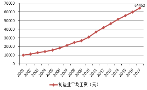 除了未來勞動(dòng)力不足之外,中國制造業(yè)員工的平均工資則呈現(xiàn)逐年增長的態(tài)勢,2017年已升至64452元,同比增長8.4%。勞動(dòng)力成本不斷上升,用機(jī)器人代替人工也是更加經(jīng)濟(jì)、符合市場規(guī)律的必然選擇。目前,“世界工廠”正不斷的從中國向東南亞等其他國家和地區(qū)轉(zhuǎn)移,中國改革開放初期借助人口紅利快速發(fā)展的條件已然不復(fù)存在。解決勞動(dòng)力不足、勞動(dòng)力成本上升的主要途徑就是智能制造,即生產(chǎn)過程的自動(dòng)化、智能化產(chǎn)業(yè)升級(jí)。未來通過產(chǎn)業(yè)的轉(zhuǎn)型升級(jí)更加注重質(zhì)量和效益的提升,“機(jī)器代人”的生產(chǎn)方式將會(huì)更加普遍。