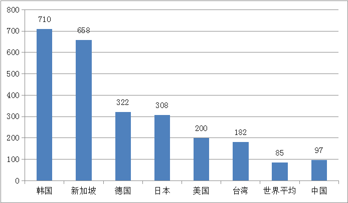 2017年全球主要市場工業(yè)機(jī)器人密度對(duì)比(臺(tái)/萬人)