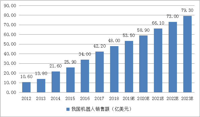 2018年,我國工業(yè)機(jī)器人銷售額達(dá)48億美元,同比增長24.1%。未來隨著生產(chǎn)方式向柔性、智能、精細(xì)轉(zhuǎn)變,對(duì)工業(yè)機(jī)器人的需求將呈現(xiàn)大幅增長。根據(jù)前瞻產(chǎn)業(yè)研究院的預(yù)測,到2023年,國內(nèi)市場規(guī)模將翻一番,進(jìn)一步擴(kuò)大到79.3億美元。