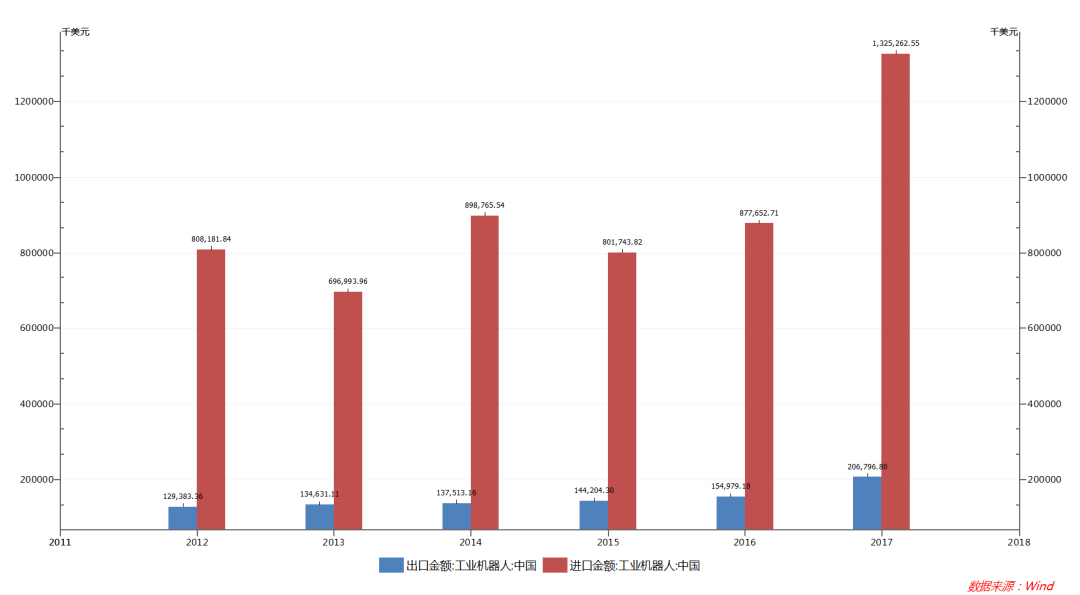 中國工業(yè)機(jī)器人進(jìn)出口金額(萬美元)