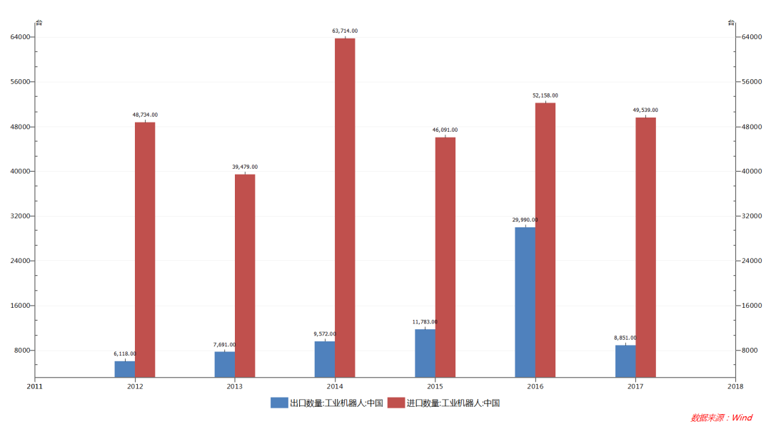 中國工業(yè)機(jī)器人進(jìn)出口數(shù)量(臺(tái))