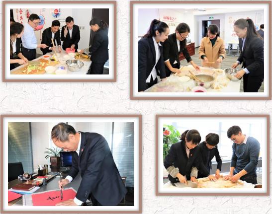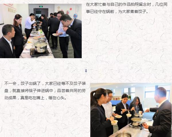 大家分成“愛吃餃子”“會(huì)做餃子”“多彩生活”和“幸福花兒”四個(gè)組合,展開了包餃子比賽。只見他們熟練的搟面皮、放餡料、捏餃子,十指翻飛之間,剁餡聲、歡笑聲、音樂(lè)聲,交織在一起,每個(gè)人臉上都洋溢著燦爛的笑容,公司里充滿了歡聲笑語(yǔ),匯聚成了一片歡樂(lè)的海洋。